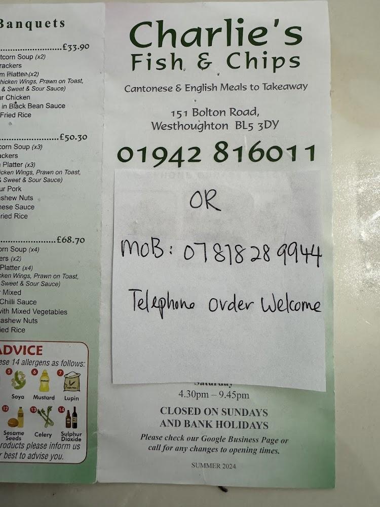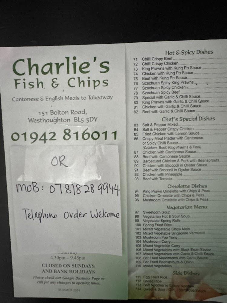 Charlie's Fish & Chips resides at 151 Bolton Rd, Westhoughton, a charming town in Bolton where community spirit thrives. The location is easily accessible, complete with wheelchair-accessible amenities, making it welcoming for all. The establishment bustles with activity throughout the week, but particularly on weekends when the fish and chips are in high demand. Charlie's holds a reputation for being more than just a takeaway; it's a gathering spot for friends and families looking to savor high-quality meals amid a casual setting.